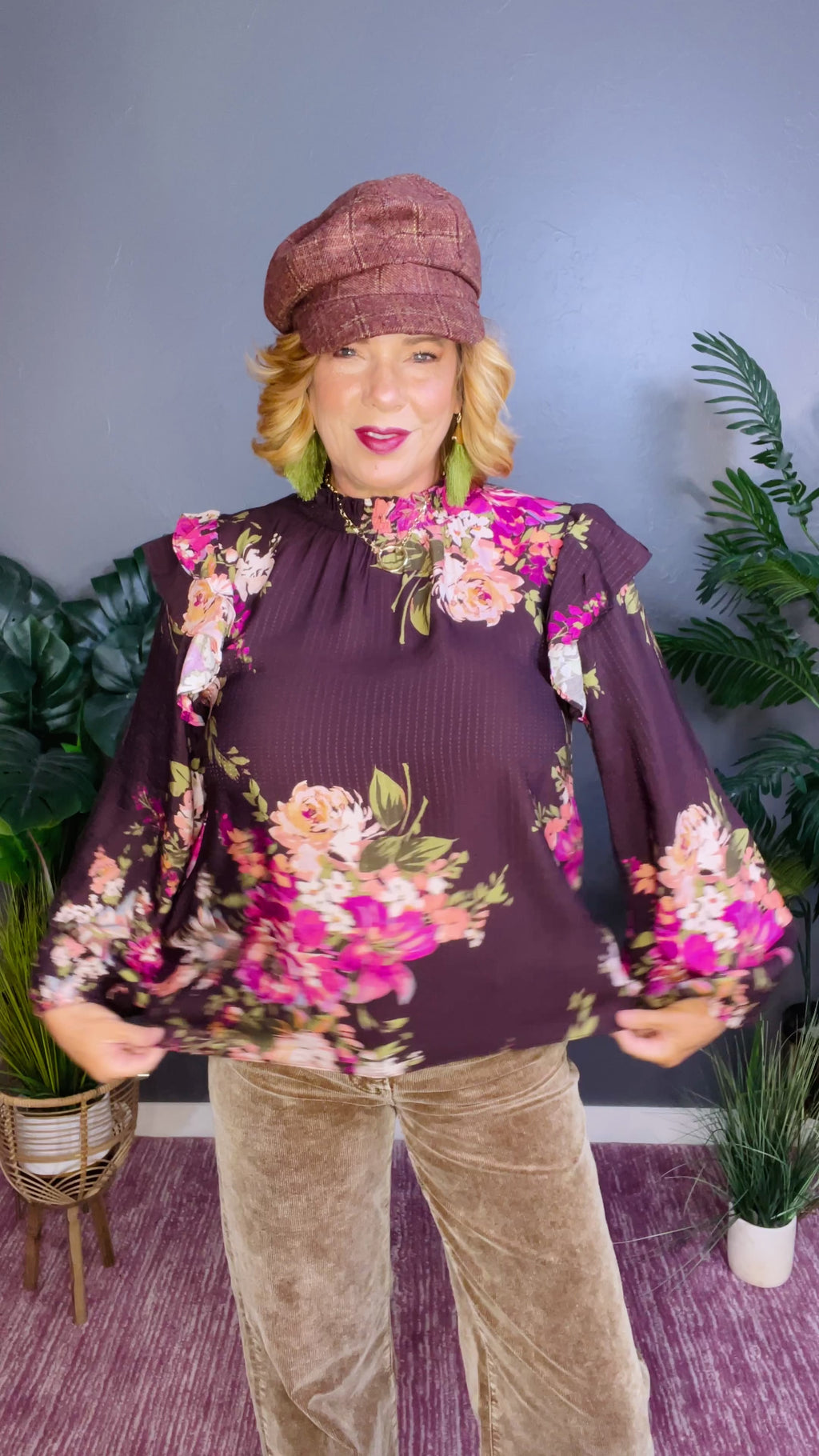 Floral printed blouse with ruffled shoulder trim, gathered mock neckline, and long sleeves with elastic cuffs.