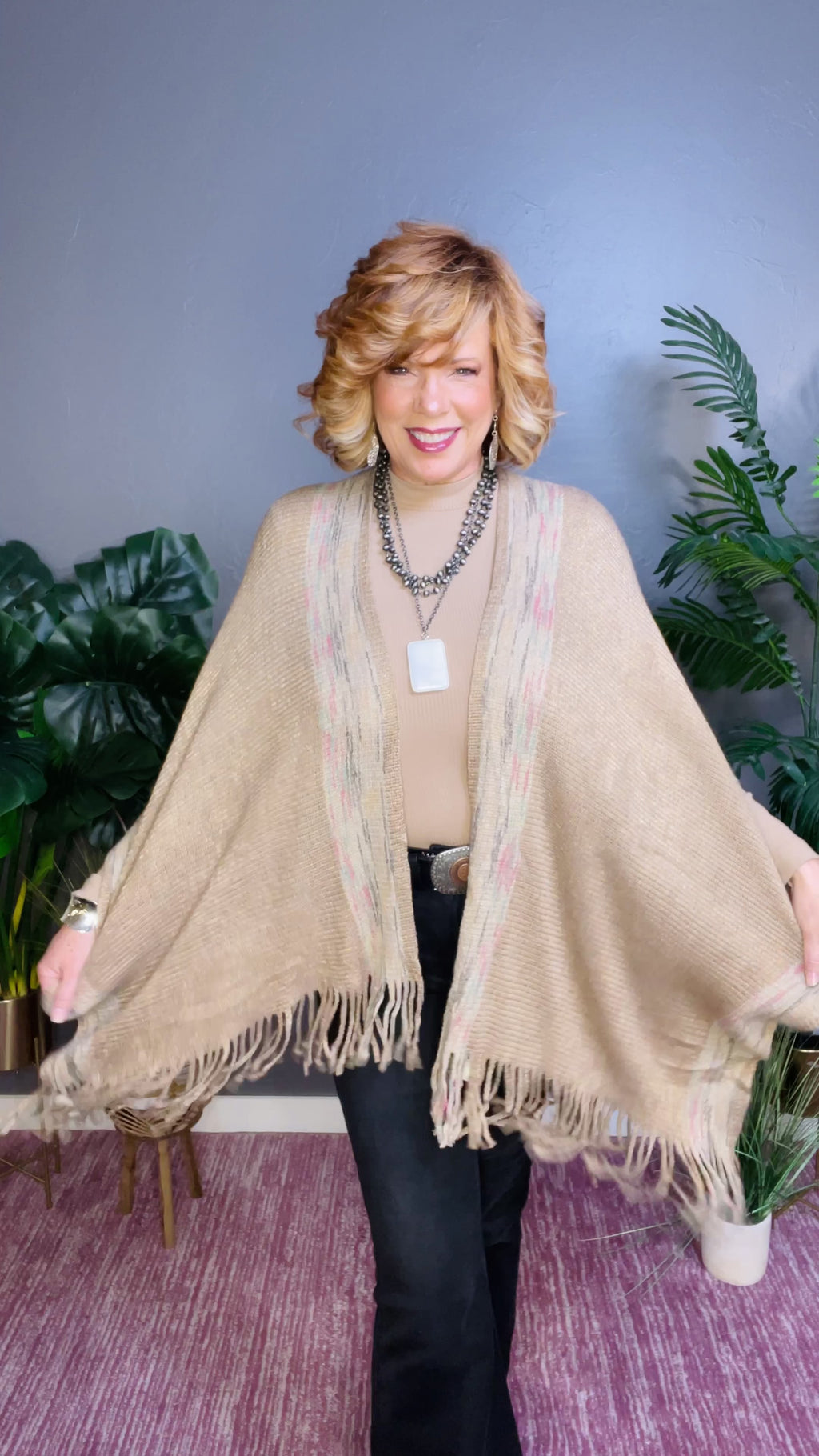 Khaki &multi color shawl w/tassels&fringe for women knitted fabric