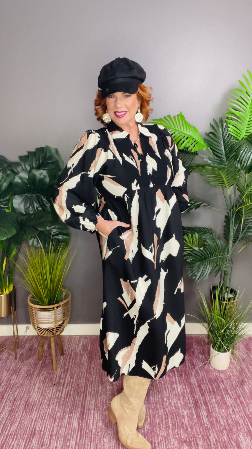 Long puff sleeves abstract print midi dress, collared neckline, chest smocking detail.