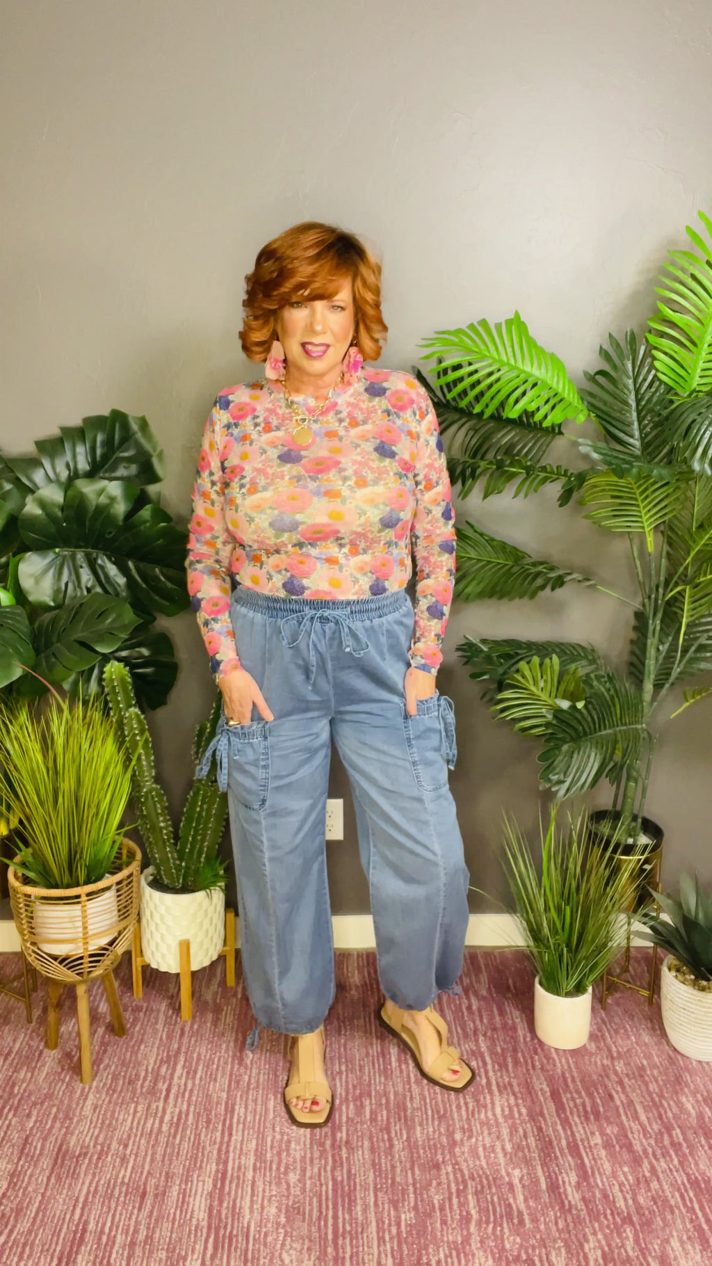 - Loose denim pants feature drawstring elastic waist for adjustable comfort.