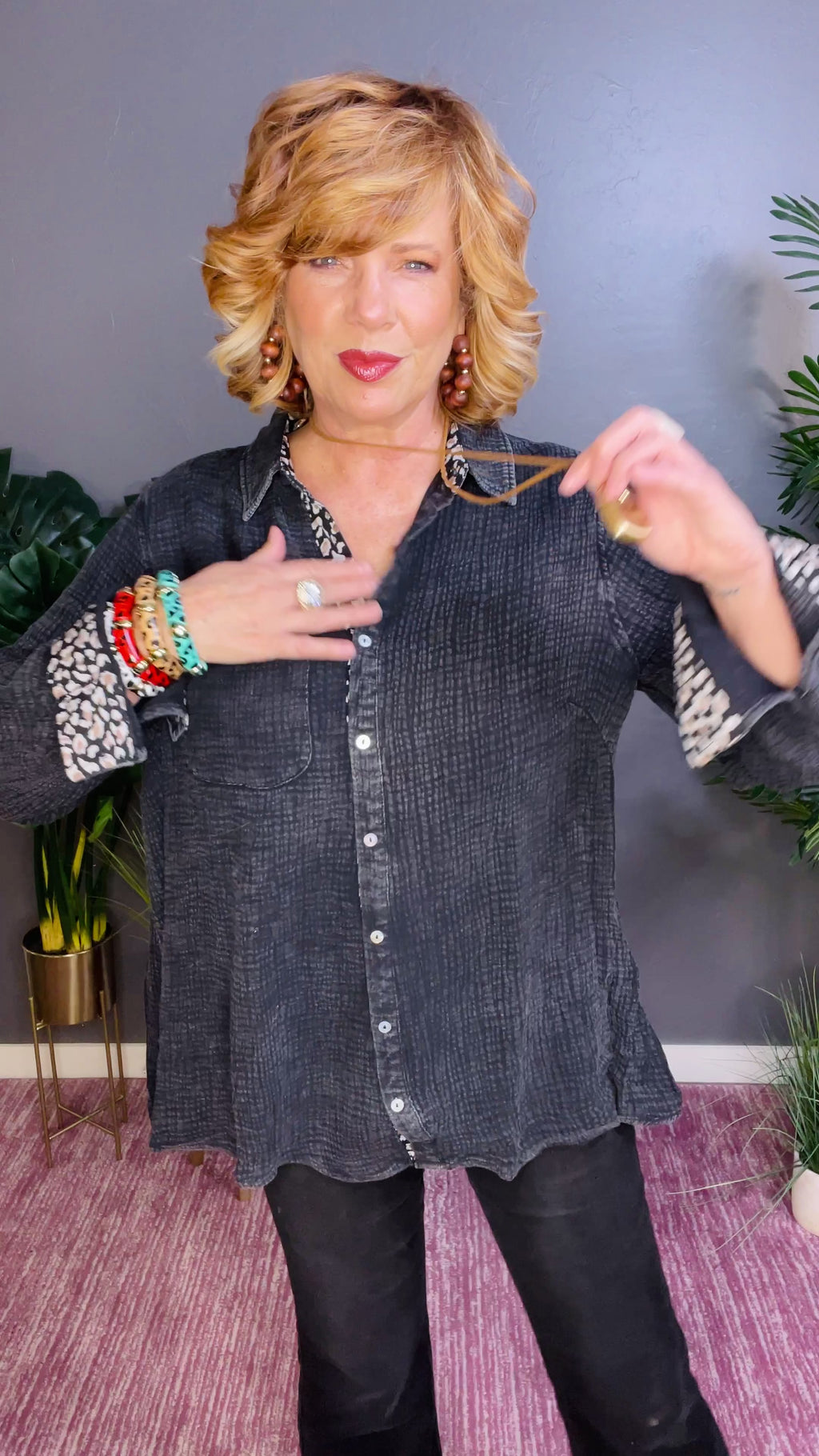 Mineral Wash Cotton Gauze Button Down Shirt with Animal Contrast Print