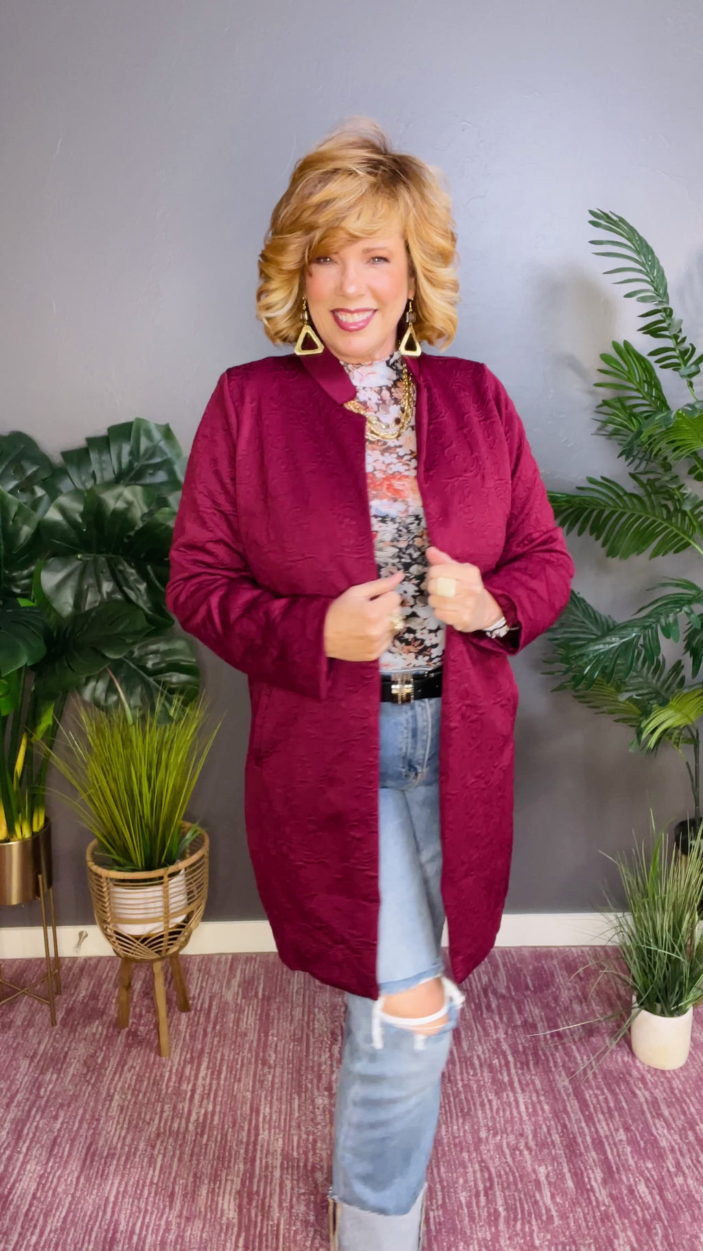 Make a statement in this elegant jacquard midi coat, where intricate texture meets timeless design. This rich pattern fabric brings depth and sophiscation to your outerwear collection. This midi length offers graceful coverage, while the structured silhouette and refind detailing create a polished look.