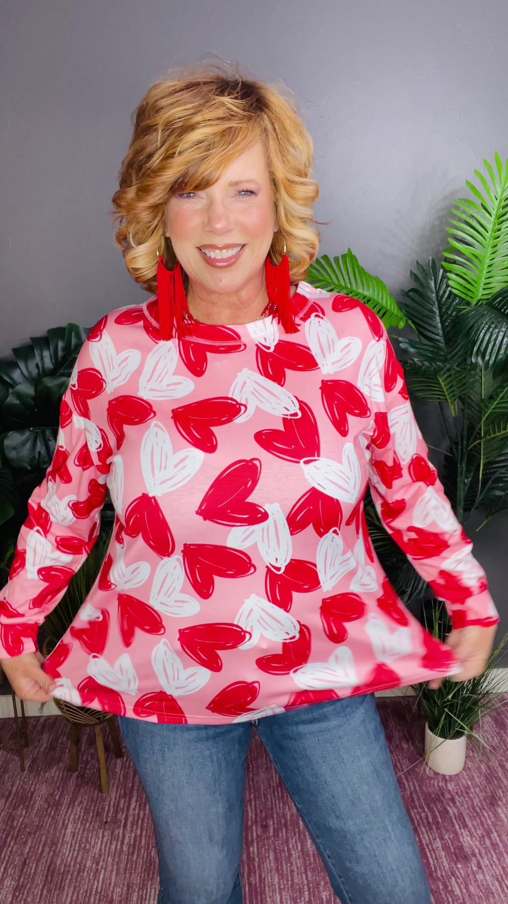 Top features with red & white hearts pritned on pink background with long sleeves.