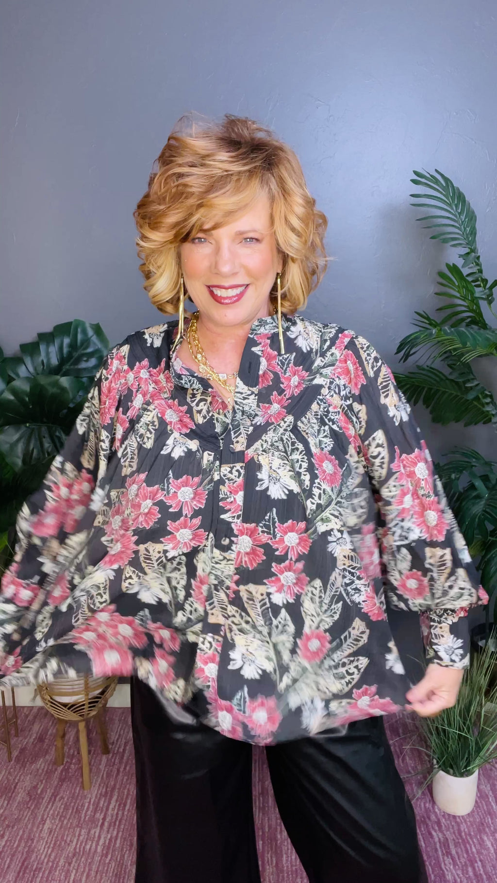 This floral blouse features a pleated front with covered button detailing, voluminous balloon sleeves with buttoned cuffs, and a flowy silhouette enhanced by soft gathering for a breezy, vintage inspired look.