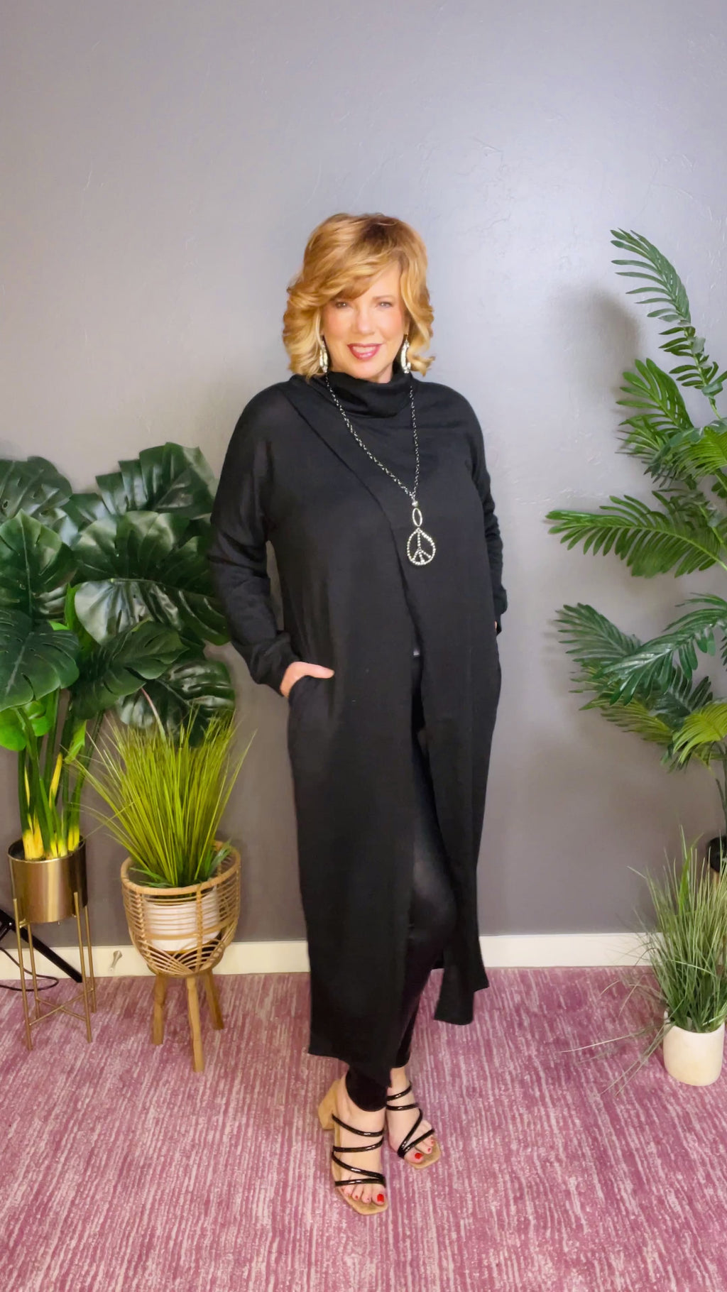Flowy and flattering. this longline duster too features a soft surolice front detail that creates an elegant. wrapped silhouette--perfect for layering over your fav. basics!