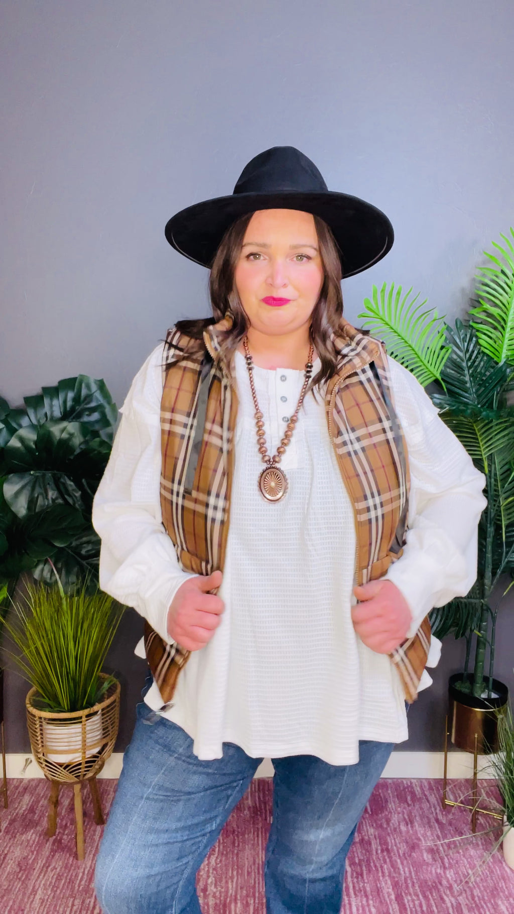 Front zip up plaid padding vest with pockets, neck strap detail.