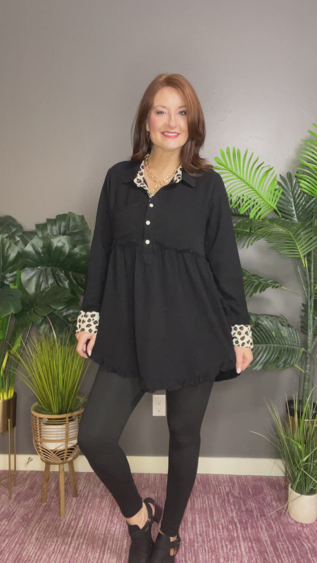 Linen Blend Animal Print Button Front and Tab Tunic Dress with Chest Pocket