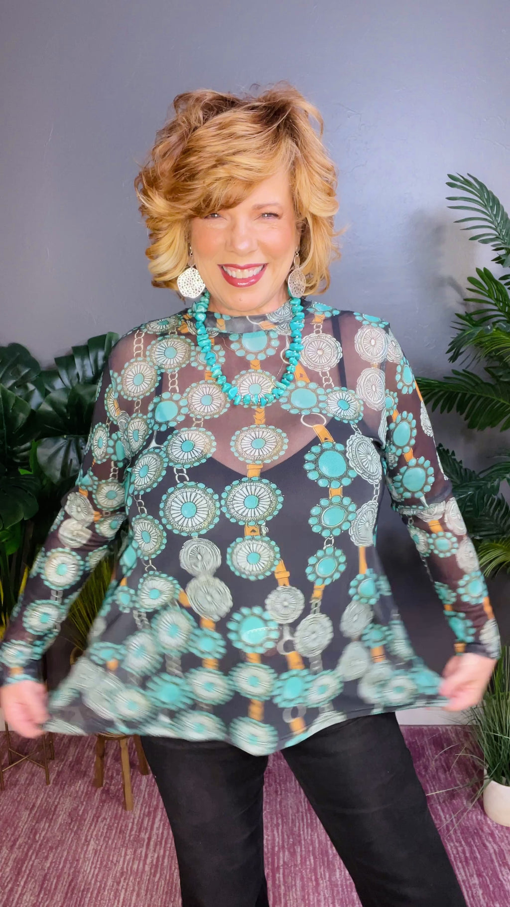Top features with western jewels printed on mesh farbic with long sleeves. Super soft, comfortable,breathable fabric, machine washable. Material: Polyester and Spandex.