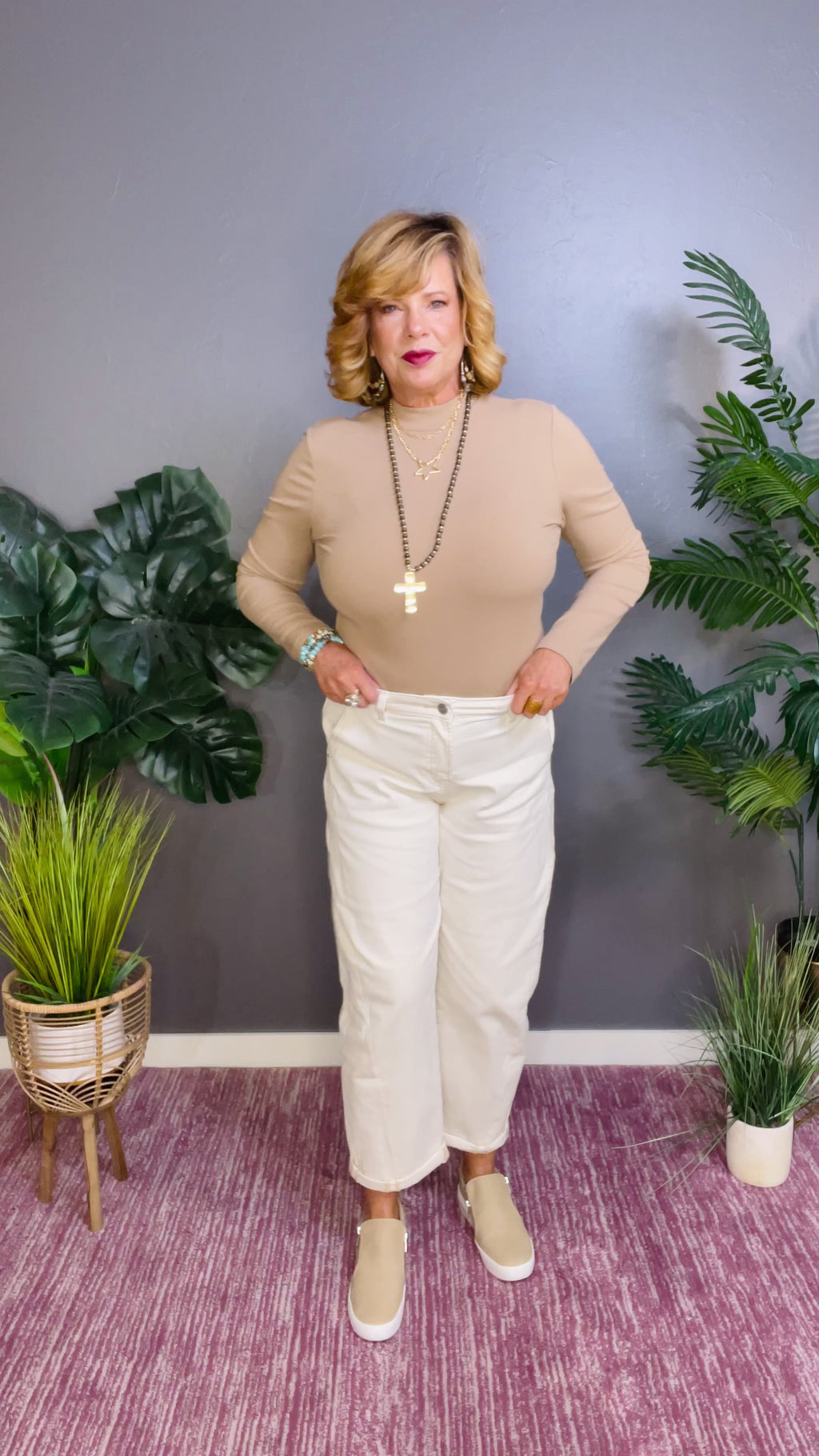 These stylish wide leg cropped jeans feature cream beige tone. Crafted from premium cotton blend denim fabric for all-day comfort and durability. The relaxed wide leg silhouette offers a flattering fit while the cropped length creates a modern, chic look. Perfect for casual outings, weekend wear, or dressed up with heels for a fashion street style. The classic five-pocket design and rolled hem details add authentic denim appeal. Easy care machine washable fabric maintains shape and color wash after wash.