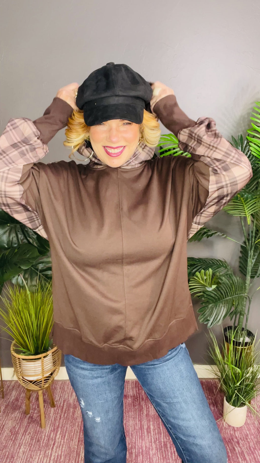 Chic hoodie features a trendy classic plaid patchwork pattern.