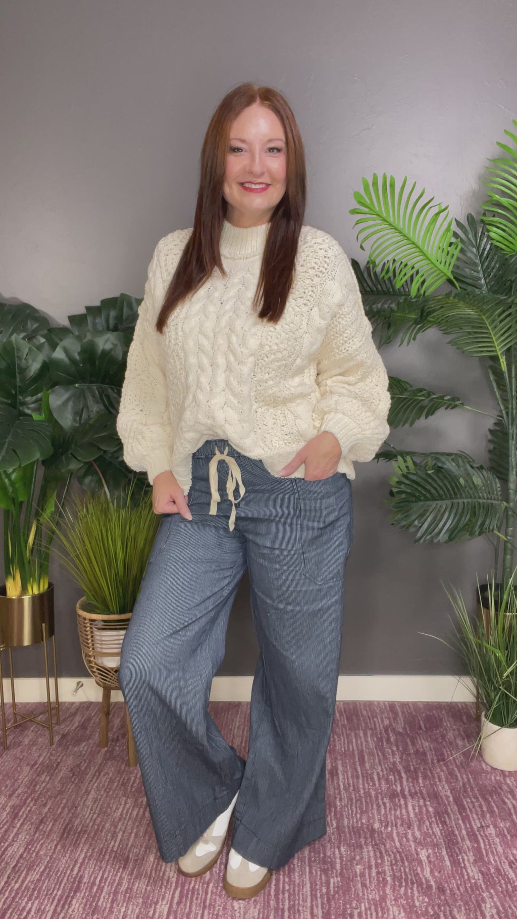 Designed in mock neck, balloon sleeve, roomy fit in chenille pullover sweater with twisted cable knitting detail.