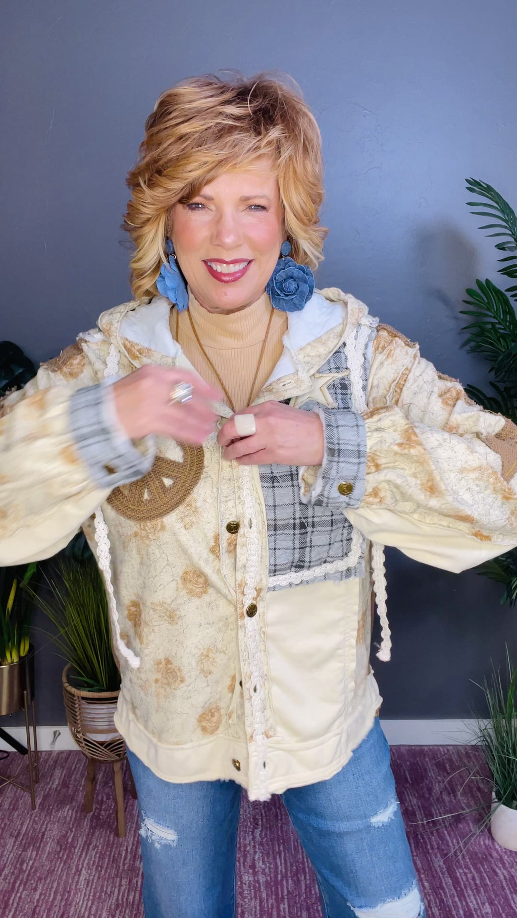 Designed in hooded long balloon sleeve relaxed fit jacket in printed terry with star & peace patch and trim detail.