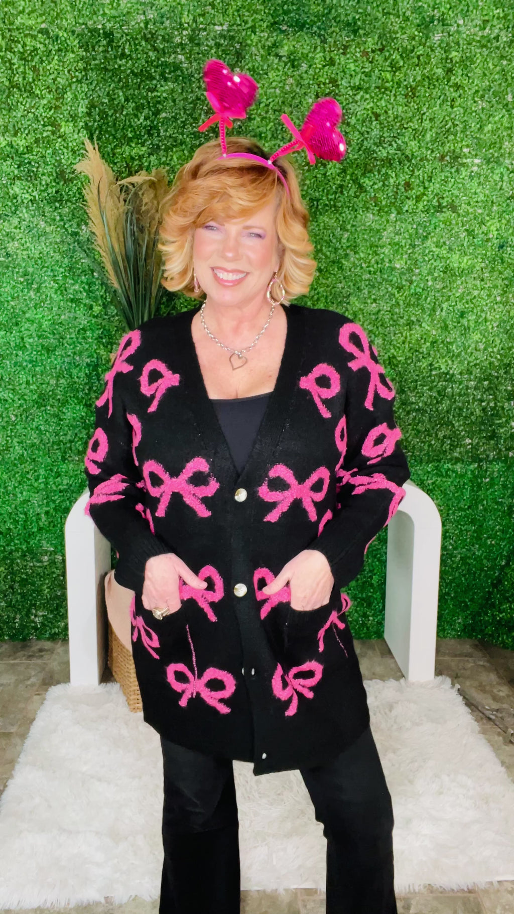 Wrap yourself in charm with the Sugar & Bows Oversized Cardigan. Featuring an ultra-cozy knit in a festive cherry red hue, this statement piece is adorned with playful ivory bow motifs all over-perfect for girly-pop lovers and coquette cuties. The slouchy silhouette, deep V-neckline, and button-front closure make it an ideal layering piece for chilly cafe dates or holiday festivities. Slip it on over a mini skirt or your favorite jeans, and finish the look with ballet flats or Mary Janes for an irresistibly sweet ensemble.