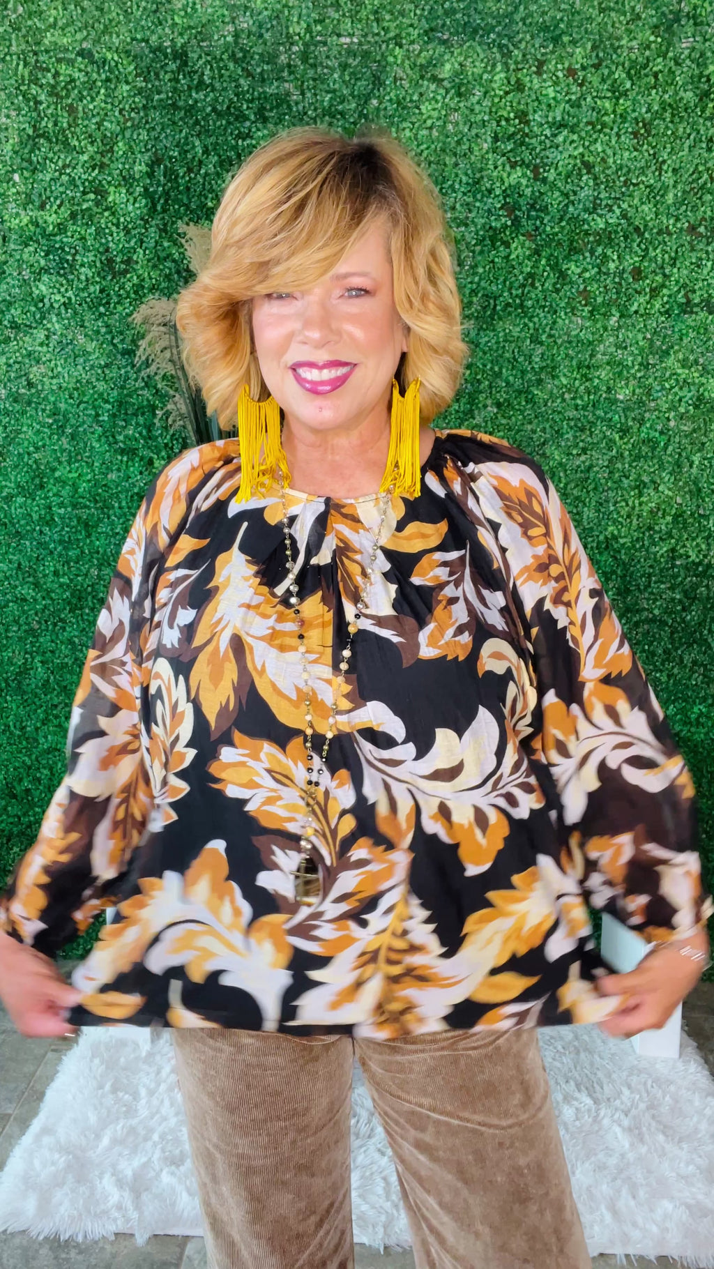 This stunning autumn-inspired blouse features a beautiful leaf print in warm earth tones of black, brown, and golden yellow. Made from lightweight chiffon material that drapes elegantly, this top offers a relaxed fit perfect for casual or semi-formal occasions. The gathered round neckline adds feminine charm while the long balloon sleeves with elastic cuffs create a fashion silhouette. The semi-sheer polyester blend fabric is comfortable and breathable, making it ideal for layering or wearing alone. Perfect for transitional seasons with its nature-inspired print and versatile styling options.