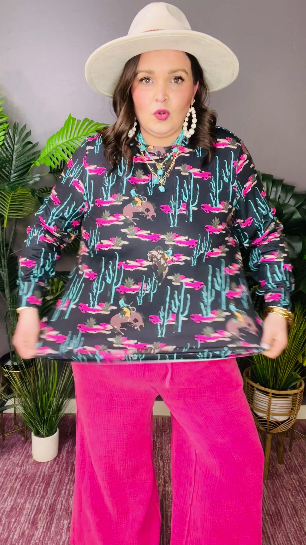 Top features with western cactus & cowboy & pink flower printed with long sleeves.