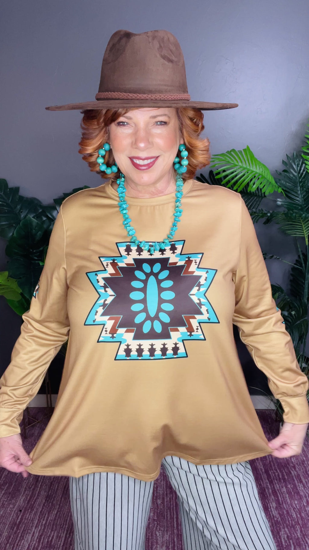 Top features with multi color western aztec printed on tan background with long sleeves.