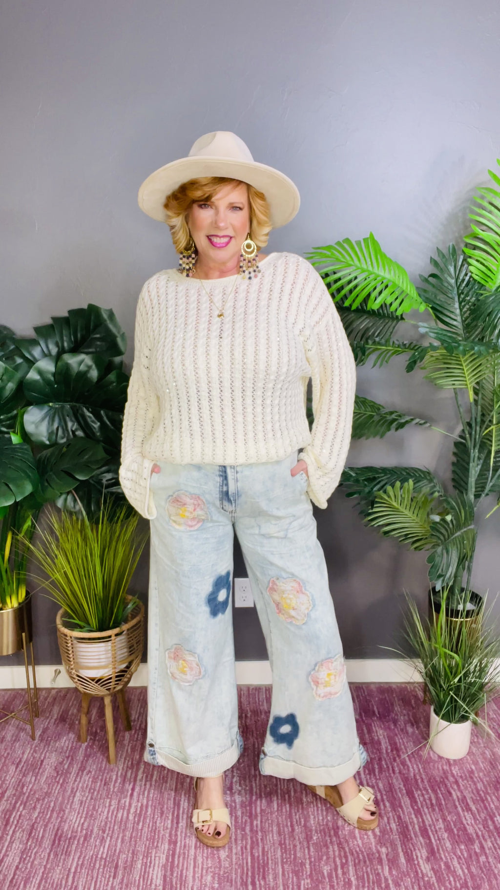 Bring effortless charm to your outfit with these floral patchworks relaxed fit pants crafted in classic denim. Designed for comfort and style, they feature a laid-back silhouette complemented by a stylish rolled-up detail at the hem. Perfect for adding a playful, vintage-inspired touch to any casual outfit.