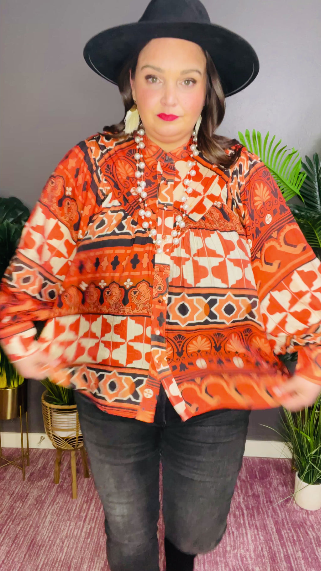 This button front top showcases a slight mock neckline, structured pleating along the yoke, voluminous long sleeves with buttoned cuffs, and a relaxed silhouette finished in a vivid geometric floral print for an effortlessly bold look.