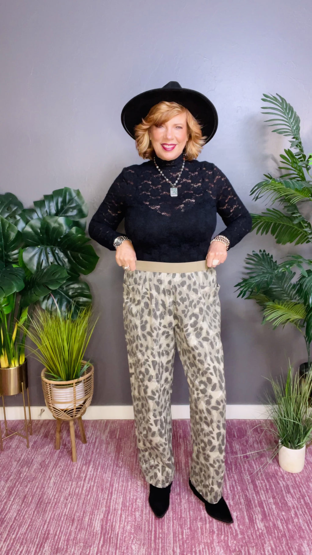 These wide-leg pants feature a bold allover animal print and an easy pull-on waistband for everyday comfort. Designed with oversized patch pockets and subtle stitched paneling, they blend function with effortless style. The relaxed fit and soft drape make them perfect for lounging or casual outings.
