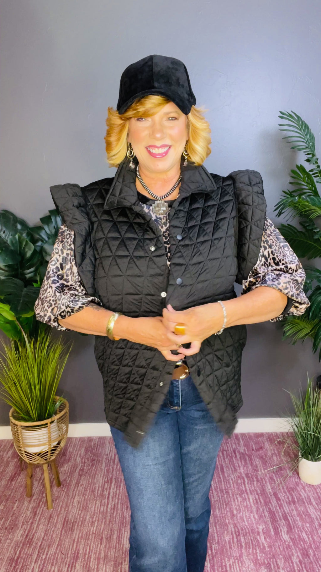 This stylish quilted vest coat features a sophisticated diamond-pattern quilted construction in classic black, perfect for layering and versatile styling. Made with premium quilted fabric that provides both warmth and breathability, this sleeveless design offers unrestricted arm movement while maintaining elegant coverage. The button-front closure and classic collar create a polished look suitable for both casual and semi-formal occasions. The textured quilted surface adds visual interest and dimension, while the black color ensures easy coordination with any wardrobe. Ideal for transitional weather, this vest coat combines functionality with contemporary fashion appeal, making it an essential layering piece for modern wardrobes.