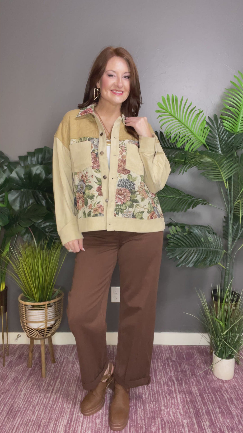 Color block patchwork jacket featuring a mix of solid corduroy and floral tapestry panels, with a quilted yoke and relaxed silhouette.